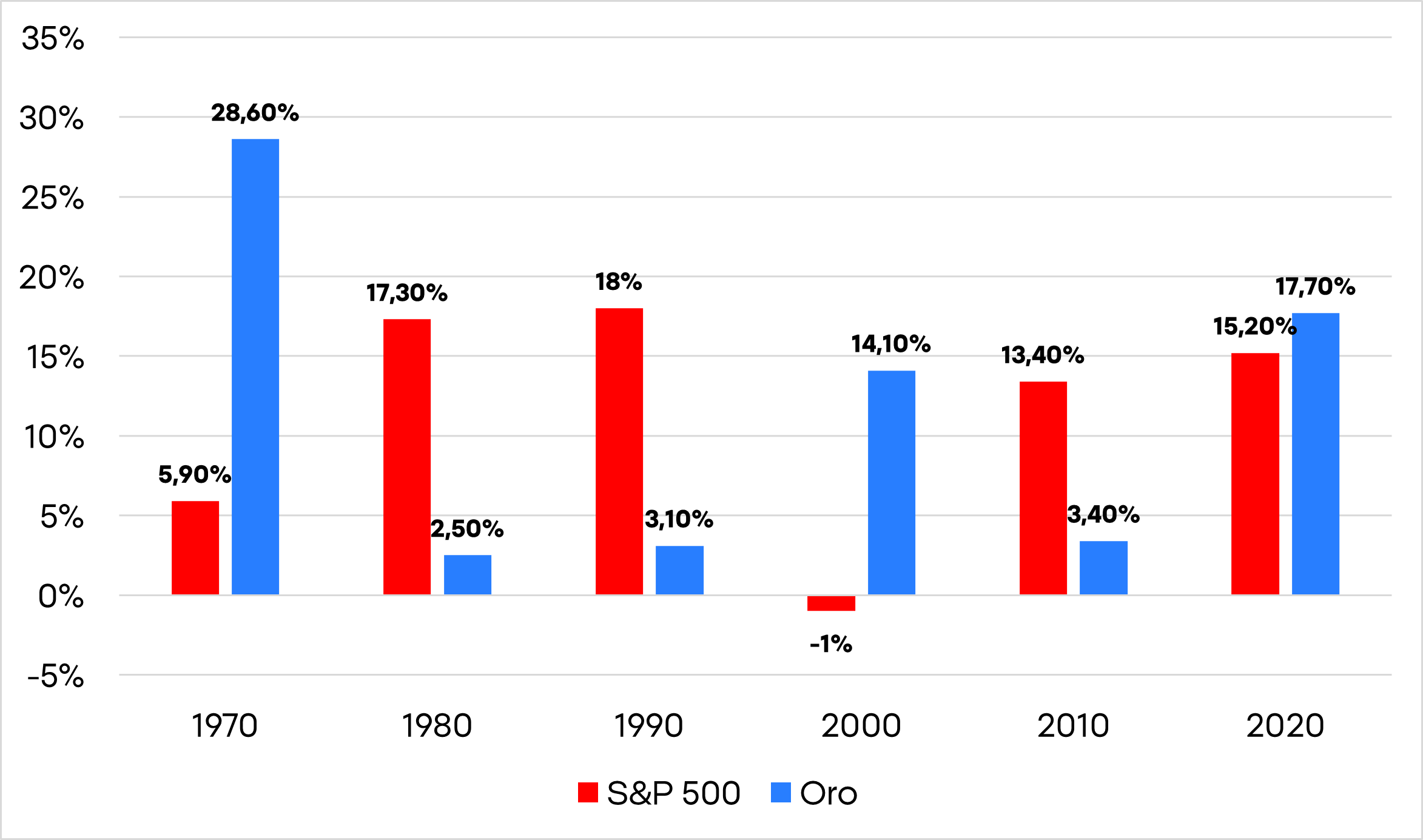 Roční výkonnost zlata a indexu S&P 500 podle desetiletí. Zdroj: XTB.