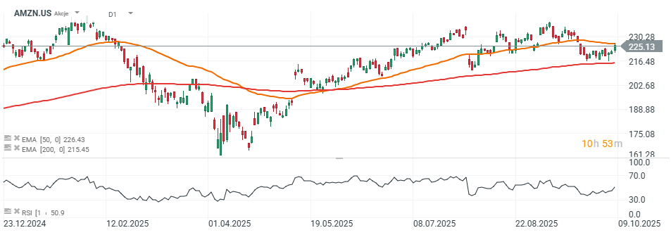 Akcie Amazonu vzrostly o více než 1,5 % v první den akce Prime Big Deal Day, zatímco Nasdaq 100 přidal 1,1 % a S&P 500 vzrostl o 0,5 %. To může odrážet rostoucí optimismus ohledně možného zlepšení e‑commerce před klíčovým svátečním čtvrtletím.