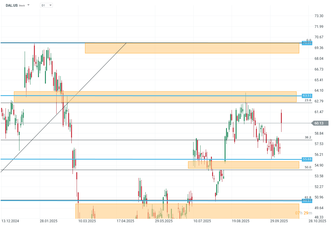 Z technického pohledu se aktuální cena akcií Delta Air Lines pohybuje okolo 60 USD, což ji řadí do širokého konsolidačního pásma, které je patrné v posledních měsících. Aby kupující převzali iniciativu, bude nezbytné prorazit klíčovou rezistenci okolo 63 USD, která koinciduje s 23,6% FIBO retracementem. Proražení této hranice by mohlo otevřít prostor pro další růst a potenciálně vést ke vytvoření nového historického maxima nad 70 USD.