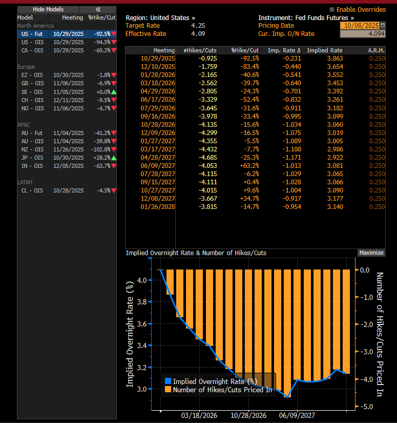 Swapový trh aktuálně přisuzuje přibližně 75% pravděpodobnost tomu, že v USA dojde ke dvěma snížením sazeb před koncem roku 2025. Fed nadále udržuje opatrný tón a zdůrazňuje dvojí riziko – růst inflace i nezaměstnanosti – zatímco se blíží konec funkčního období Jeroma Powella. I pokud by Fed skutečně ukončil pauzu v uvolňování politiky, která začala v prosinci 2024, opravdový holubičí posun se zatím nekoná.
