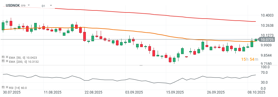 Norský index spotřebitelských cen dosáhl meziroční úrovně 3,6 % oproti očekávaným 3,5 % a předchozím 3,5 %. Pár USD/NOK dnes roste a dostává se nad zónu rezistence EMA50.