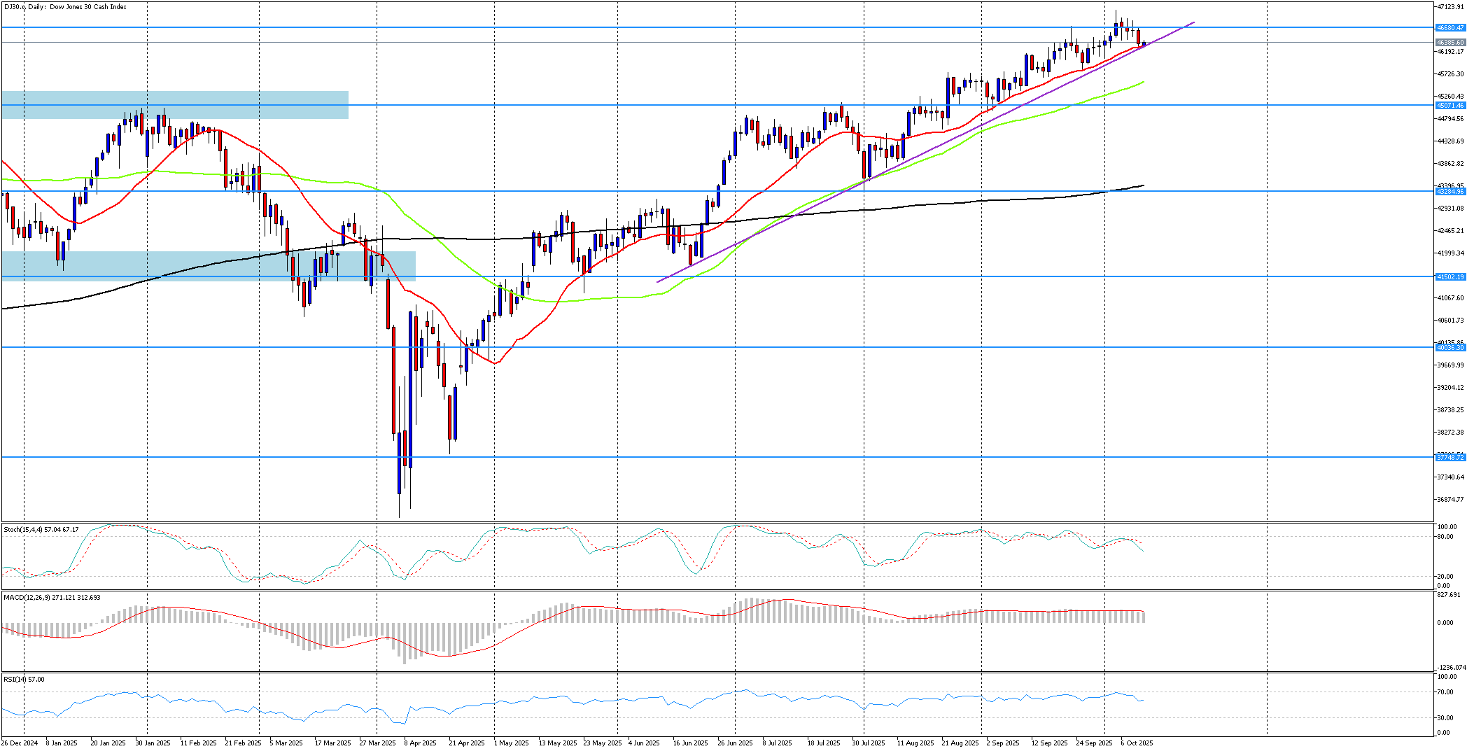 Americký hotovostní index DJ30 se stáhl ze svého historického maxima na úrovni 47 052,25 a v současnosti testuje souběh krátkodobé i dlouhodobé vzestupné trendové linie. Indexu se zatím nepodařilo zajistit denní uzavření nad hranicí 46 750, což omezuje další růstový impuls. V blízkosti současných úrovní však může dojít k odrazu, který podporuje 20denní jednoduchý klouzavý průměr (SMA) poblíž 46 500. Pokud se býčí momentum obnoví, index by mohl opět otestovat odpor v oblasti 46 750 a případně se vrátit k historickému maximu. Trvalé proražení nad tuto zónu by otevřelo prostor k dalším vzestupným cílům, včetně psychologické úrovně 47 500. Naopak, pohyb pod hranicí 46 000 by mohl zvýšit riziko hlubší korekce a nasměrovat index k 50dennímu SMA na úrovni 45 500, případně k další významné podpoře v oblasti 45 280. Z technického pohledu se stochastický oscilátor stahuje z překoupené oblasti, což naznačuje zpomalování růstové dynamiky. MACD se drží těsně pod svou signální linií, ale zůstává nad nulovou úrovní, což naznačuje neutrální tendenci. Index DJ30 se tak nachází v klíčové zóně, kde se trh rozhoduje o dalším směru. Pokud úrovně podpory zůstanou zachovány, pravděpodobnost odrazu zůstává vysoká, zatímco průlom pod 46 000 by mohl otevřít prostor pro korekční fázi.