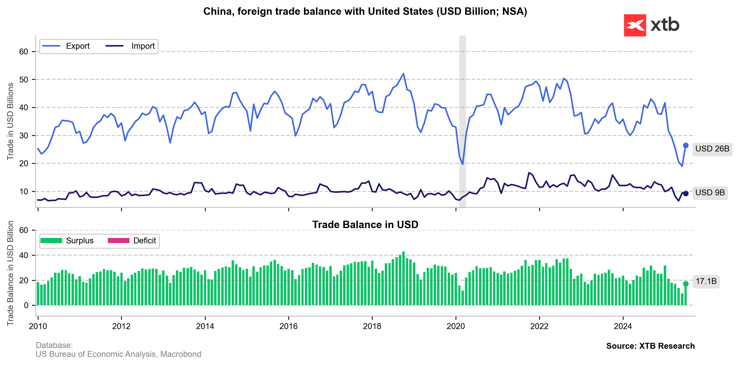Export do USA výrazně poklesl od začátku obchodní války v dubnu, ale ostatní regiony výpadek nahradily. Dovoz z USA do Číny však zůstal relativně stabilní.
