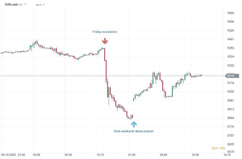 Mírná deeskalace následovala o víkendu po příspěvku Donalda Trumpa, v němž ujistil, že USA a Čína dosáhnou dohody, a zdůraznil, že obchodní válka neprospívá ani jedné straně. Trhy stále doufají v možnou schůzku Xi–Trump na summitu APEC později tento měsíc, i když rozsah možných výsledků se rozšířil. Krátkodobě dopad napětí tlumí rostoucí export na trhy mimo USA, předzásobení komoditami (ocel, uhlí, sója z Jižní Ameriky) a přesměrování obchodu přes centra jako Vietnam – nicméně trojnásobná cla USA by představovala zásadní dezinflační šok pro čínský exportní sektor a ránu pro globální riziková aktiva.