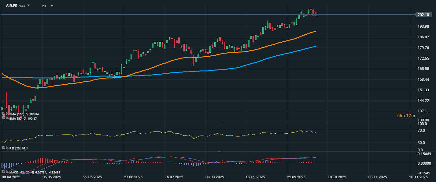 Akcie společnosti Airbus pokračují v silném růstovém trendu a aktuálně se obchodují na ceně 202,10 EUR. Cena se stabilně drží nad 50denním klouzavým průměrem EMA (190,87 EUR) i nad 100denním SMA (180,84 EUR), což potvrzuje silné býčí nastavení trhu. RSI dosahuje hodnoty 63,1, tedy se nachází v blízkosti překoupené zóny, ale stále pod kritickou hranicí 70. To naznačuje stále prostor pro další růst, i když tempo může být mírnější. MACD zůstává v pozitivním teritoriu a rozdíl mezi hlavní a signální linií se rozšiřuje, což podporuje pokračování vzestupného trendu.