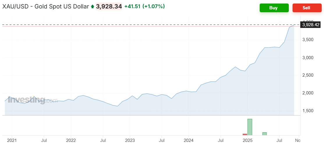 V pátek 3. října 2025 se cena futures kontraktů zastavila na 3 908 USD za unci, čímž klesla z předchozích maxim, což však trvalo jen chvíli, a k 6. říjnu 2025 opět vzrostla k novému rekordu na úrovni 3 952 USD. Přesto zlato z dlouhodobého hlediska zaznamenalo nárůst o desítky procent. Ve srovnání se stejným obdobím před rokem šlo o 48 % a při pohledu na 5letou výkonnost to bylo více než 107 %.