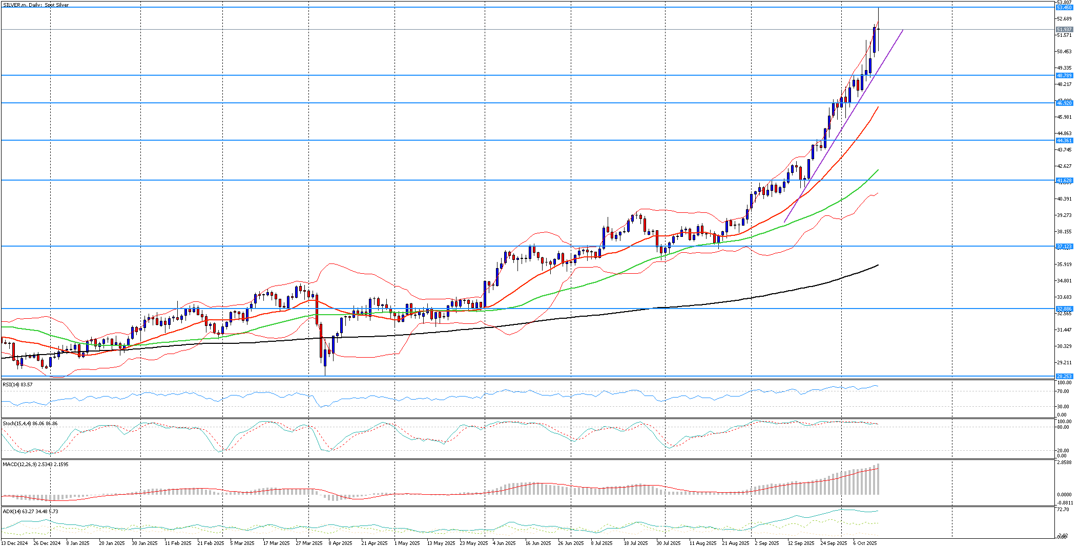 Stříbro v posledních dnech pokračovalo v mimořádně silném růstovém trendu a vystoupalo na nové historické maximum, jen krátce poté, co vůbec poprvé překonalo psychologickou hranici 50 dolarů za unci. Během aktuální seance dosáhlo intradenního vrcholu na 53,44 USD, odkud následně mírně korigovalo. Říjen zatím přinesl nárůst o téměř 10 %, čímž se celková výkonnost za rok zvýšila přibližně na 77 % – jde o jeden z nejlepších výsledků mezi komoditami v roce. Růst zájmu o drahé kovy podporuje globální ekonomická i geopolitická nejistota, která vede investory k hledání bezpečných aktiv. Stříbro navíc těží z toho, že představuje cenově dostupnější alternativu ke zlatu, přičemž obdobný trend sledujeme i u platiny a palladia, jejichž růst je zároveň posilován vysokou průmyslovou poptávkou. Přestože dlouhodobý sentiment zůstává pozitivní, technické ukazatele upozorňují na možnost krátkodobého vyčerpání růstu. Cena již od konce srpna opakovaně překonává horní hranici Bollingerova pásma, což značí přehřátý trh. Současně stochastický oscilátor od konce září vykresluje sérii nižších minim, což naznačuje slábnoucí býčí momentum. Na druhé straně RSI nadále roste a setrvává v překoupeném pásmu, což signalizuje, že další růst může pokračovat, dokud se neobjeví výraznější prodejní tlak. Pokud býci udrží kontrolu, nejbližší rezistenci lze hledat na psychologické hladině 54,00 USD, přičemž následný cíl by se mohl posunout směrem k 55,00 USD. Naopak v případě korekce by trh mohl nejprve otestovat spodní linii krátkodobého rostoucího kanálu v oblasti 49,00 USD. Proražení této zóny by otevřelo prostor pro pokles k 20dennímu klouzavému průměru – který zároveň tvoří střed Bollingerova pásma – poblíž 46,20 USD. Při hlubším oslabení by 50denní SMA mohl nabídnout další podporu mírně nad úrovní 42,00 USD. Celkově lze říci, že stříbro zůstává v robustním býčím trendu, avšak technické signály naznačují, že tempo růstu se může krátkodobě zpomalit.