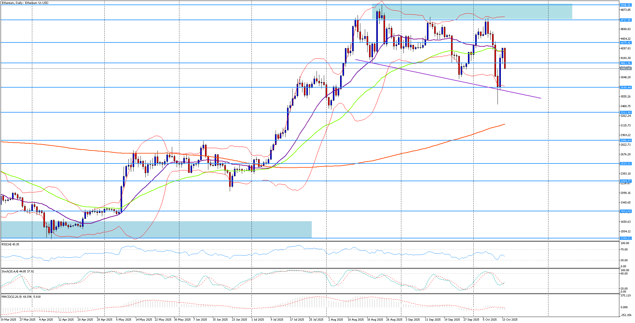 Ether se po prudkém výprodeji z minulého týdne postupně zotavuje. Pád byl spuštěn obnoveným napětím v obchodních vztazích mezi Spojenými státy a Čínou, které vyvolalo rozsáhlou vlnu výprodejů napříč kryptoměnovým trhem. Během pouhých 24 hodin došlo k likvidacím v hodnotě přes 19 miliard dolarů, což představuje největší jednodenní ztrátu v historii kryptoměn z hlediska dolarového objemu. Ether, druhá největší digitální měna na světě, tehdy klesl o více než 20 % na denní minimum 3 701 USD – úroveň, kterou trh naposledy zaznamenal na začátku srpna. Poté se však odrazil o více než 12 % a nyní se obchoduje v blízkosti 4 300 USD. Technické ukazatele momentálně poskytují smíšené signály. MACD se stále nachází v záporném teritoriu, což udržuje lehce medvědí nádech trhu. Naproti tomu RSI se pohybuje kolem hodnoty 47, jen těsně pod neutrální úrovní 50, zatímco stochastický oscilátor se drží nad přeprodanou oblastí, což naznačuje, že prodejní tlak postupně slábne. Pokud by Ether dokázal uzavřít obchodní den nad oblastí rezistence mezi 4 232–4 258 USD, kterou tvoří sbíhající se 20denní a 50denní klouzavé průměry, mohl by se prostor pro oživení dále rozšířit. Trvalé překonání této zóny by otevřelo cestu k opětovnému testu klíčové úrovně 4 500 USD, která na začátku října fungovala jako výrazná podpora. Další růstový impuls by pak mohl směřovat k měsíčním maximům v okolí 4 700 USD. Naopak, pokud by Ether neudržel současné hodnoty a opět klesl pod hranici 4 000 USD, hrozil by návrat směrem k 3 830 USD – minimu z 25. září. Následný pokles by mohl zamířit až ke dvěma měsíčnímu minimu poblíž 3 700 USD. Výraznější oslabení by však pravděpodobně tlumila silná technická podpora na 200denním klouzavém průměru poblíž 3 530 USD.
