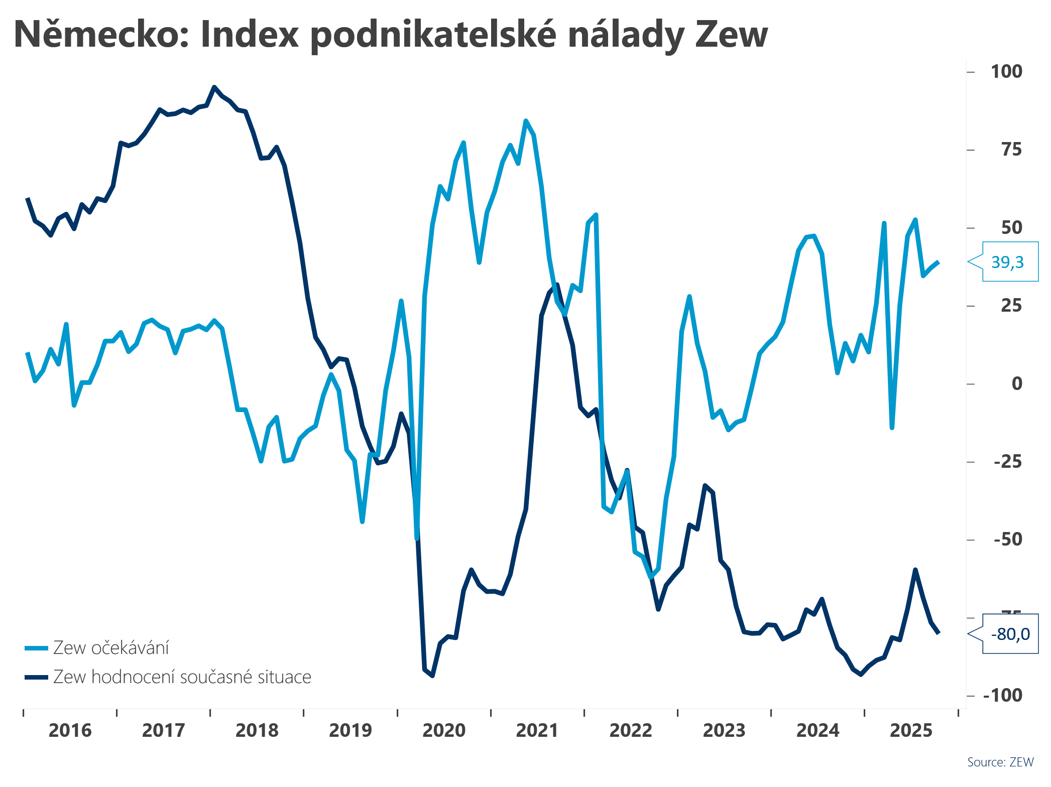 Index podnikatelské nálady Zew očekávání klesl v květnu na -10,7 b. oproti 4,1 b. v dubnu, přičemž trhy očekávaly pokles na -5 b. Rovněž index hodnocení současné situace klesl na -34,8 b. oproti -32,5 b., když trhy očekávaly pokles na -37,5 b. -