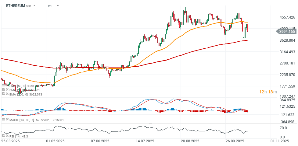 Ethereum kleslo pod klíčovou úroveň 4 000 USD a nedokázalo prorazit nad 50denní EMA, aby znovu získalo trvalý býčí momentum.
