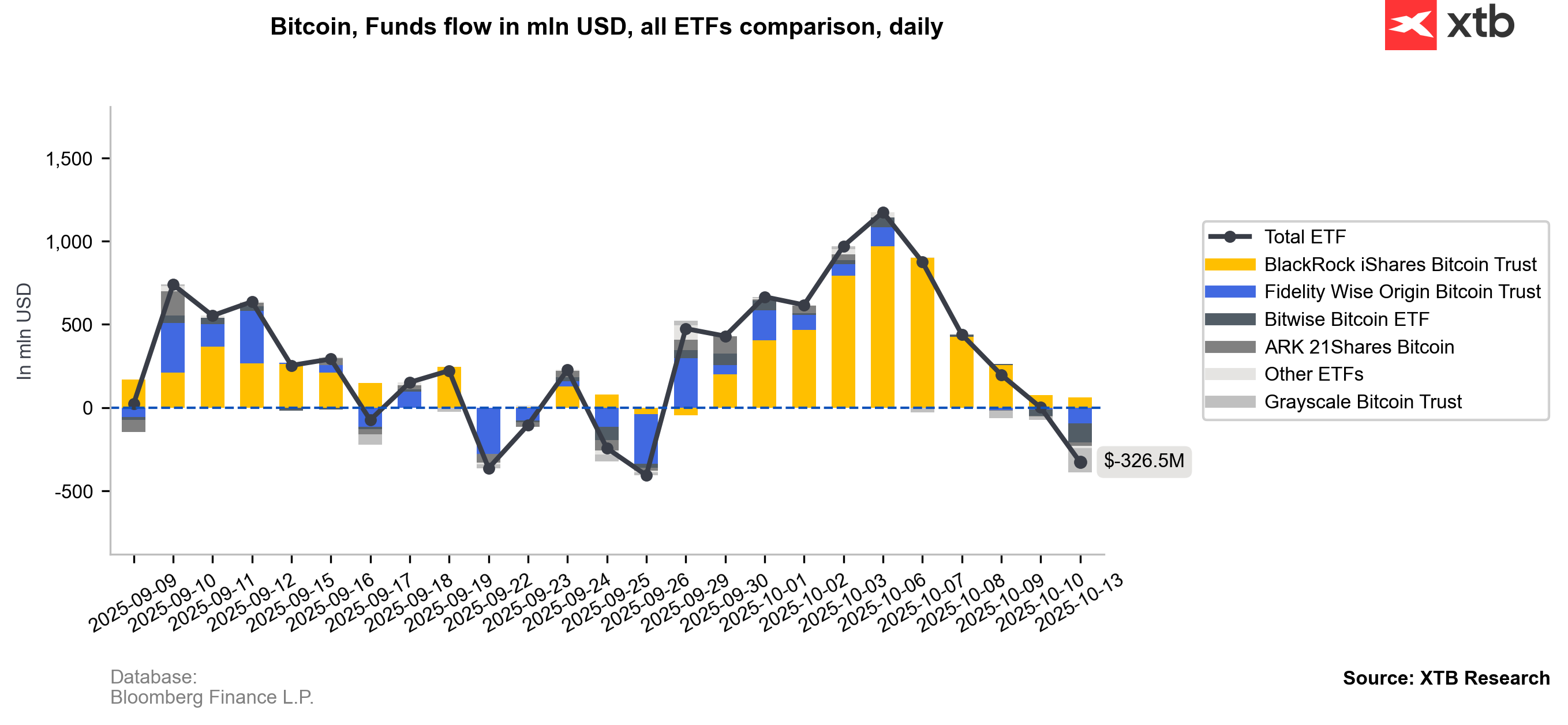 Přílivy do Bitcoin ETF byly v pátek a pondělí záporné (–326 milionů USD).