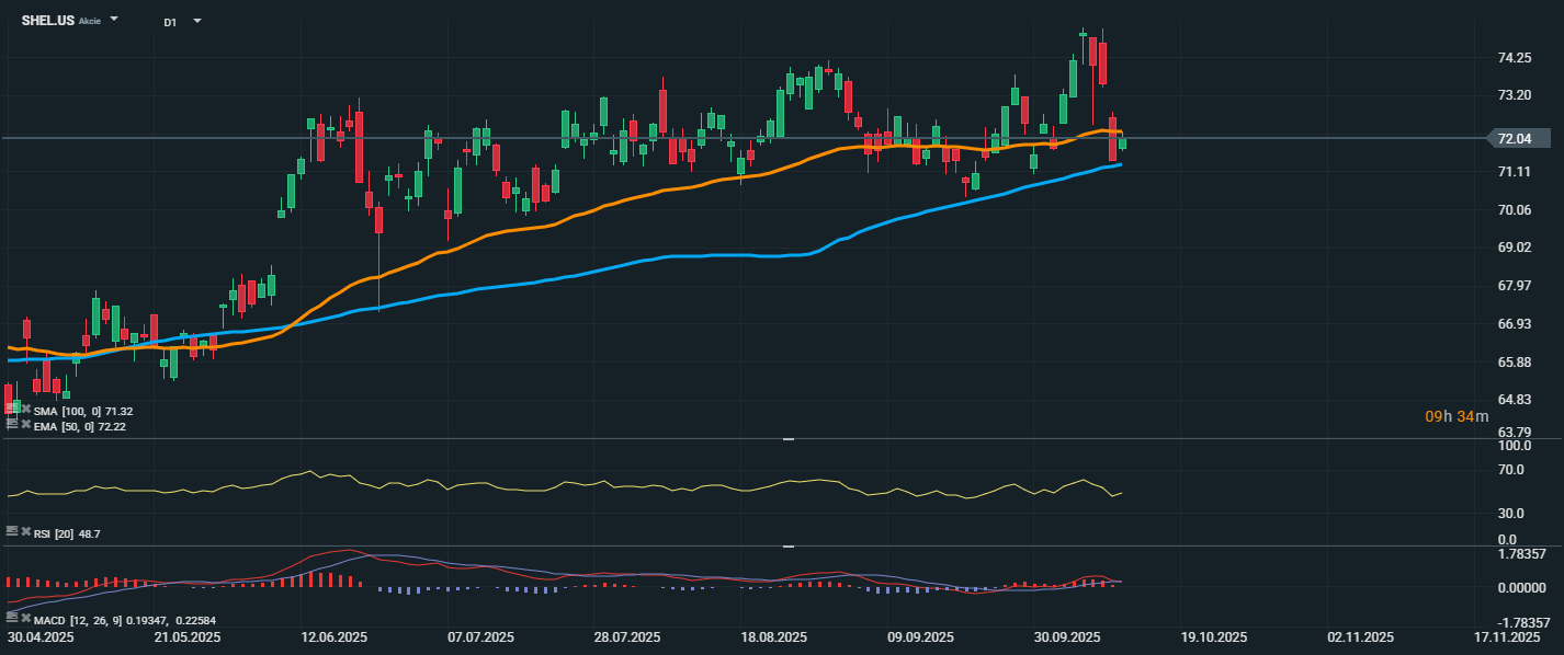 Cena akcií se nyní nachází na 72,04 USD, těsně nad SMA 100 (71,32 USD), zatímco EMA 50 (72,22 USD) byla krátce proražena směrem dolů. RSI dosahuje hodnoty 48,7 a pohybuje se v neutrálním pásmu, tedy bez známek překoupenosti nebo přeprodanosti. MACD je mírně negativní, s potenciálem dalšího oslabení, pokud by nedošlo k opětovnému odrazu nad EMA 50.