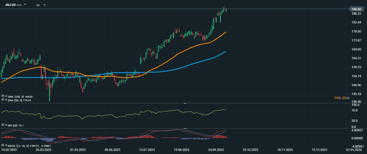 Akcie společnosti Johnson & Johnson se aktuálně obchodují na úrovni 190,60 USD. Akcie se nachází v jasném býčím trendu, potvrzeném rostoucími klouzavými průměry EMA 50 (178,34 USD) a SMA 100 (168,00 USD), od kterých se cena v předchozích týdnech několikrát odrazila. RSI se vyšplhal na 73,1, což značí vstup do překoupeného pásma. Tento signál může upozorňovat na možnou krátkodobou korekci nebo zpomalení růstu, nicméně zatím není potvrzen technickým obratem.
