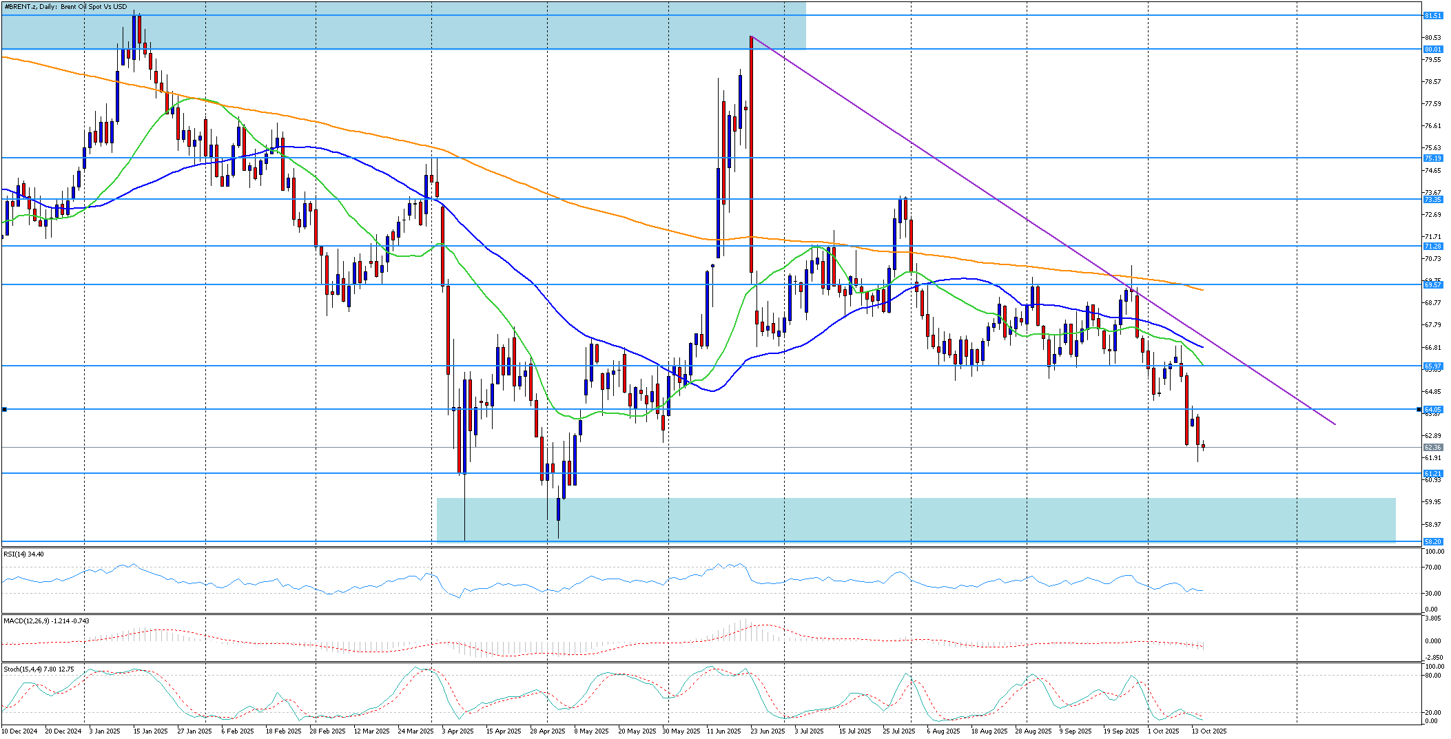 Cena ropy Brent zaznamenala v pátek výrazný pokles, který vedl k prolomení důležité podpůrné úrovně v oblasti 64,00. Tato zóna nyní funguje jako nová rezistence. Na začátku týdne se sice cena mírně zotavila, avšak růst byl v blízkosti této hranice rychle zastaven a následně se obnovil sestupný pohyb. Jelikož se Brent aktuálně obchoduje hluboko pod úrovní 66,30, která tvořila spodní hranici obchodního pásma mezi 5. srpnem a 1. říjnem, krátkodobý technický výhled zůstává jasně medvědí. Indikátory momenta potvrzují převažující prodejní tlak. RSI se pohybuje pod neutrální úrovní 50, blízko hranice 30, a jeho směr je klesající, což naznačuje přetrvávající slabost trhu. Stejně tak MACD setrvává pod nulovou i signální linií, což podporuje negativní technický obraz a naznačuje, že kontrola zůstává v rukou medvědů. V případě pokračování poklesu by se cena mohla přiblížit k významné podpůrné oblasti mezi 61,20 a 60,00, která v dubnu a květnu sloužila jako spolehlivé dno. Proražení této zóny by mohlo otevřít cestu k dalším ztrátám a posunout Brent do cenových úrovní naposledy testovaných v roce 2021. V takovém scénáři by trh mohl zamířit až k lednovým minimům kolem 58,25 USD za barel. Naopak, pro návrat k neutrálnímu výhledu by bylo zapotřebí, aby se cena vrátila nad 65,30 USD. Takový pohyb by signalizoval návrat ropy do dřívějšího bočního pásma a oslabení medvědího tlaku. Významné zlepšení technického obrazu by však přinesl až rozhodující průlom nad klíčovou rezistenční zónu poblíž 69,57 USD, který by mohl potvrdit začátek stabilnějšího oživení.