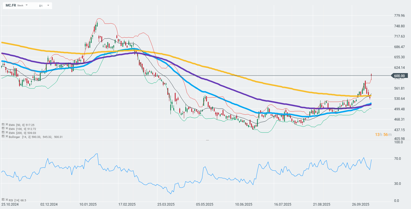 LVMH (MC.FR) ve své poslední čtvrtletní zprávě zaznamenal překvapivě pozitivní obrat, což naznačuje, že luxusní móda si možná znovu získává přízeň investorů. Po dvou čtvrtletích poklesu se LVMH podařilo zastavit trend slábnoucí poptávky po luxusním zboží, když vykázal 1% organický růst tržeb a výrazné zlepšení v klíčových segmentech – zejména silná poptávka po značkách Moët & Chandon a Dior. Toto překvapení vedlo k více než 13% skoku ceny akcií při otevření trhu, což dočasně způsobilo pozastavení obchodování kvůli rychlé volatilitě.