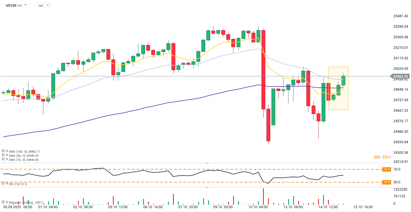 Přestože je makrokalendář na dnešek velmi skromný – a kromě amerických velkoobchodních akcií (15:00) nebudou zveřejněna žádná významná data – index US100 může zaznamenat vyšší volatilitu, taženou prohlášeními tří členů Fedu, kteří dnes promluví ( 15:00 Perli, 16:30 Bostic, 20:30 Waller, 22:00 Kashkari) a všeobecné zlepšení nálady na globálním trhu. A co víc, americké společnosti (hlavně finanční sektor - Wells Fargo (WFC.US) nebo BlackRock (BLK.US) ) tento týden oznámí finanční výsledky. I když nejsou součástí Nasdaq 100, index může reagovat i na potenciálně větší reakce S&P 500. -