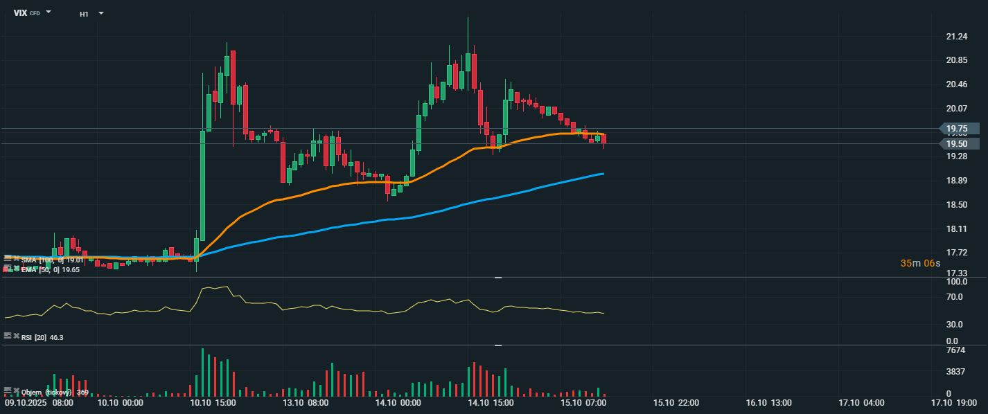 Index volatility VIX, který měří očekávané cenové výkyvy akciového indexu S&P 500, zaznamenal v minulých dnech prudký nárůst nad úroveň 21 bodů, což reflektovalo zvýšenou nejistotu a nervozitu investorů. Následně však došlo k částečné stabilizaci a korekci, přičemž aktuálně se index obchoduje na hodnotě 19,75 bodu. Technicky se cena nachází nad klouzavým průměrem EMA 50 (19,65), avšak pouze těsně, což značí možnost dalšího oslabení v případě prolomení této podpory. SMA 100 (19,01) představuje další klíčovou úroveň podpory, kterou trh zatím respektuje. Momentum růstu však zjevně ochabuje, o čemž svědčí pozvolný pokles posledních svíček a nižší objemy obchodování. RSI se nachází na úrovni 46,3, což značí neutrální nastavení – trh není ani překoupený, ani přeprodaný. Přesto se nálada mírně uklidňuje, a pokud nedojde k novým negativním zprávám z geopolitiky či makra, může VIX dále oslabovat směrem k hranici 19 nebo až 18,5 bodu. Vzhledem k tomu, že v uplynulých dnech došlo k výraznému nárůstu a následné konsolidaci, může být aktuální pokles vnímán jako výdech po panickém výkyvu, nikoliv zatím jako signál pro hlubší uklidnění trhu.