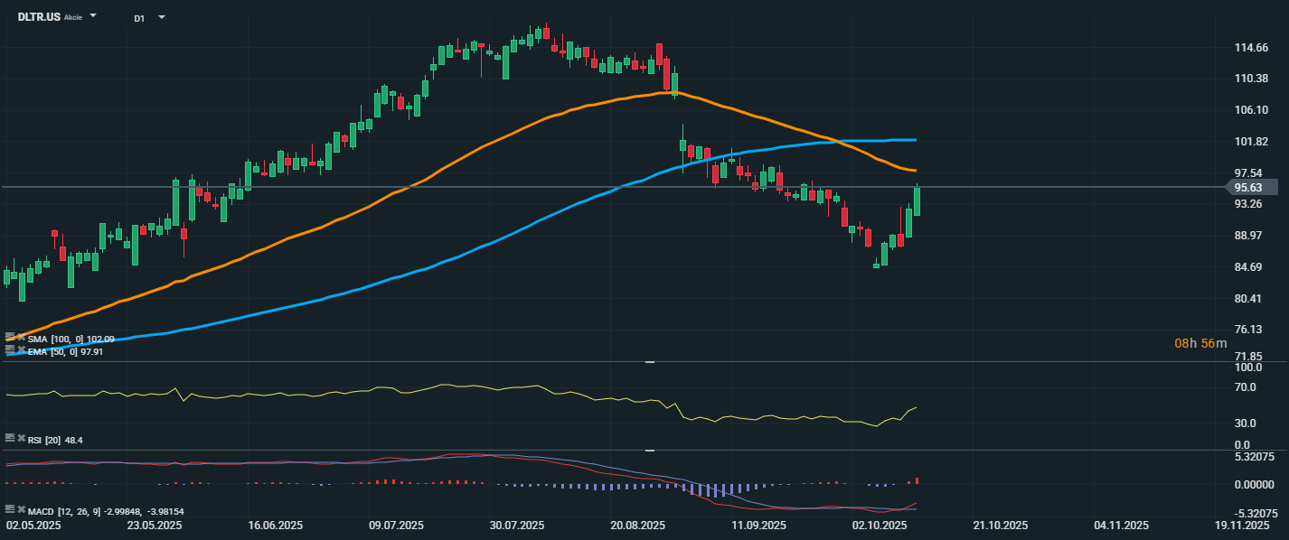 Akcie společnosti Dollar Tree zaznamenaly v posledních dnech prudký růst a aktuálně se obchodují na úrovni 95,63 USD, čímž se přiblížily k úrovni klouzavého průměru EMA 50 (97,91 USD). Technicky však cena zatím zůstává pod EMA 50 i SMA 100 (102,09 USD), což znamená, že z pohledu střednědobého trendu se stále nachází v korekční fázi. RSI na hodnotě 48,4 naznačuje neutrální pásmo, přičemž stále existuje prostor pro růst bez překoupenosti. MACD začíná zlepšovat svou trajektorii, i když hodnoty zůstávají záporné, což značí, že potvrzení obratu trendu zatím chybí.