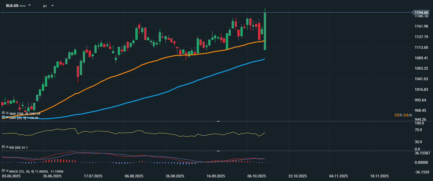 Cena akcií BlackRock se odrazila od klouzavého průměru EMA 50 (1190,30 USD) a zůstává výrazně nad SMA 100 (1097,34 USD), což potvrzuje dlouhodobý růstový trend. RSI se nachází na hodnotě 61,1, tedy v neutrálně-býčí zóně, bez známek překoupení. MACD vykazuje pozitivní hodnoty, přičemž je blízko možného býčího překřížení, což podporuje možnost pokračování růstového trendu.