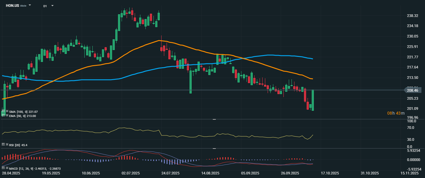 Akcie společnosti Honeywell se aktuálně obchodují na úrovni 208,46 USD a po krátkodobém poklesu vykazují známky obratu. Poslední svíčka naznačuje silnější nákupní zájem, který přišel po propadu k úrovni kolem 201 USD. Přesto však akcie zůstávají pod oběma klouzavými průměry – EMA 50 (213,00 USD) a SMA 100 (221,07 USD), což indikuje stále přetrvávající sestupný trend. RSI se nachází na úrovni 45,4, tedy v neutrálním pásmu, bez známek přeprodanosti, ale s prostorem pro další růst.