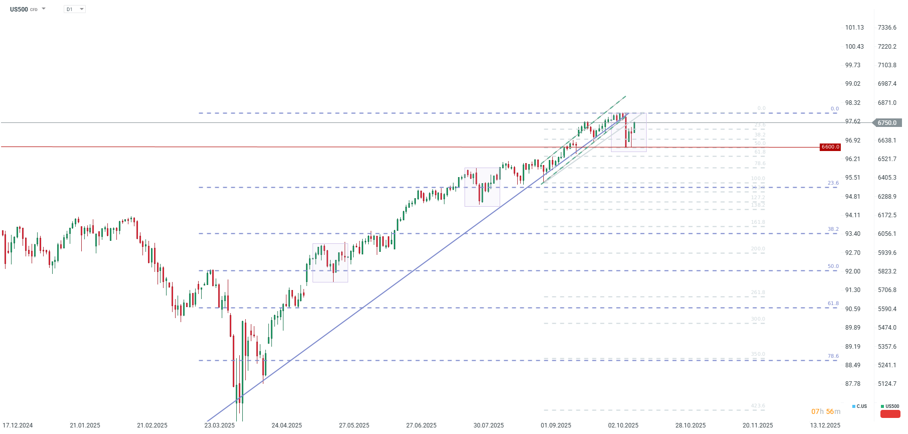Důležité je, že index neprorazil hlavní korekční úroveň v rámci rostoucího trendu z května a července, což může naznačovat návrat k hlavní růstové trajektorii. Navíc se index US500 udržel nad hladinou 50% Fibonacciho retracementu kratší vlny růstu, která začala počátkem září.