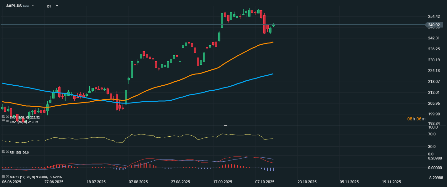 Akcie společnosti Apple se aktuálně obchodují na úrovni 249,92 USD a po krátkodobé korekci se snaží o stabilizaci. Pokles z předešlých dnů se zastavil těsně nad hladinou klouzavého průměru EMA 50 (240,19 USD), který spolu se SMA 100 (222,52 USD) tvoří klíčové technické podpory a potvrzují stále silný dlouhodobý růstový trend. RSI na úrovni 56,6 se nachází v neutrálním až mírně býčím teritoriu, bez známek překoupenosti.