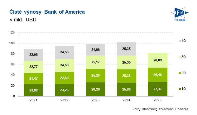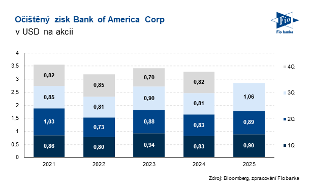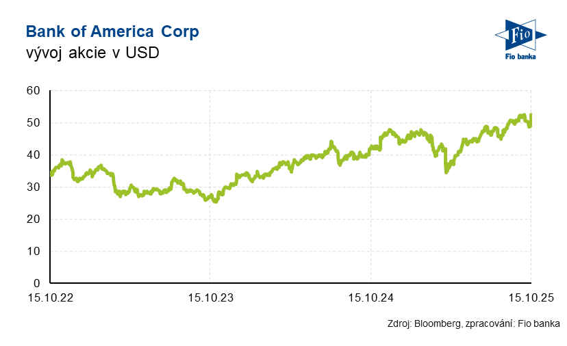 Bank of America reportovala výsledky za třetí kvartál 2025. Pozitivně trhy reagují na překonané očekávání u výnosů z obchodování. Konsenzus překonaly také čisté úrokové výnosy, které meziročně vzrostly o 1,2 mld. USD.