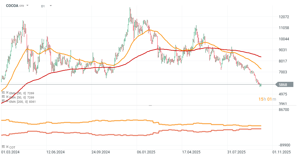 Ceny kakaa se vrátily nad 10 000 USD za tunu, což vedlo k obrovské likvidaci krátkých pozic. Růst cen je stále poháněn obavami ze snižujících se globálních dodávek kakaa, ale obecně je chuť spekulantů riskovat vysoká, což vede k silnému umisťování pozic u některých komodit, jako je kakao a v posledních dnech také měď. Západoafričtí dodavatelé kakaa mohou nedodržet smlouvy o dodávkách, protože přetrvává nejhorší nedostatek dodávek za posledních 40 let. -
