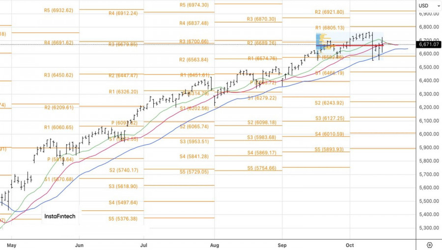 Z technického hlediska se v denním grafu ukazuje snaha býků na indexu S&P 500 obnovit růstový trend. Trh však zatím uvízl v mrtvé zóně – v oblasti shluku klouzavých průměrů a fair value. Nákupní pozice získávají relevantní až od úrovně 6 725. Pokud se ceně nepodaří udržet nad touto hladinou, riziko konsolidace poroste a otevře se prostor pro prodej.