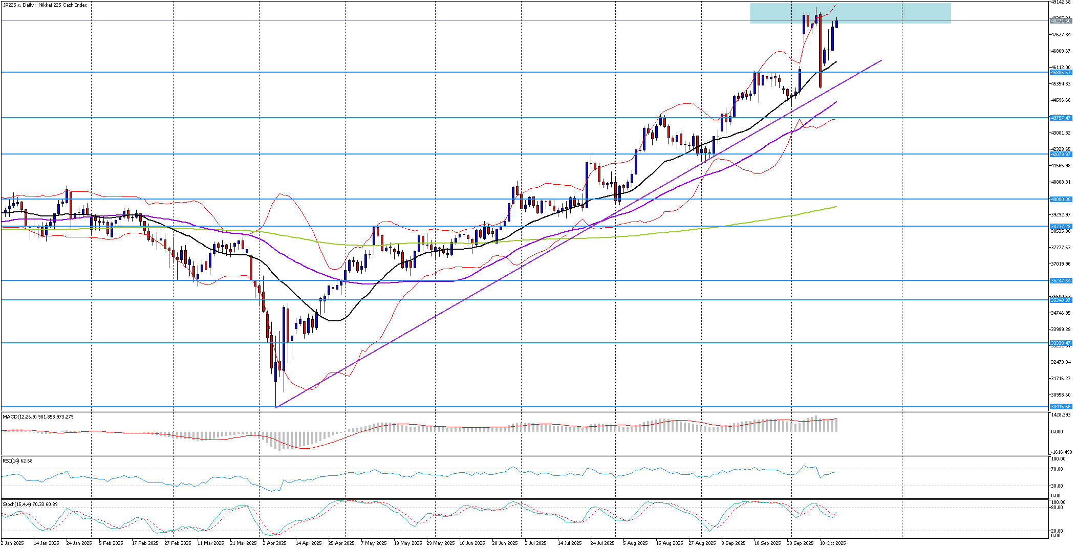 Akciový index JP225 ve středu navázal na třídenní růstovou korekci a pokračoval v zotavení po nejprudším propadu od dubna, který nastal v pátek minulého týdne. Růst podporuje obnovený optimismus ohledně možného dalšího snižování úrokových sazeb ze strany amerického Fedu, jenž převážil nad obavami z nových obchodních napětí mezi USA a Čínou i nad politickou nejistotou v Japonsku. Index během dne přidal více než 1,8 % a dosáhl intradenního maxima 48 240 bodů, čímž smazal část předchozí ztráty o 2,6 %, kdy se propadl až na 46 442 bodů. Nadále však přetrvává napětí kolem výběru nového japonského premiéra po rozpadu dlouholeté vládní koalice, což udržuje na trzích zvýšenou míru opatrnosti. Výsledek tohoto politického procesu může mít zásadní dopad na budoucí směřování hospodářské politiky Japonska a potenciálně se stát impulzem pro další růst indexu. Prozatím se trhy zdají být relativně klidné a převažuje očekávání, že expanzivní fiskální politika bude pokračovat bez ohledu na konečné rozložení moci. Očekávané rozvolnění fiskální politiky však nemusí být doprovázeno stejným přístupem v oblasti měnové politiky. Z technického pohledu JP225 na týdenní bázi ztratil 0,87 %, avšak v meziročním srovnání stále vykazuje nárůst přes 20 %. Pokud by se pozitivní momentum obnovilo a fiskální očekávání zůstala příznivá, index by mohl znovu otestovat své historické maximum 48 878 bodů ze dne 9. října, což je přibližně 1,36 % nad aktuální úrovní. Krátkodobě však zůstává zvýšené riziko poklesu, a to především kvůli nejistotě spojené s domácí politickou situací. Technické indikátory rovněž naznačují ochlazení tempa růstu. MACD se pohybuje mírně na své červené signální linii v překoupené oblasti, zatímco RSI osciluje kolem střední linie, těsně nad neutrální úrovní. V případě obnovení poklesu by klíčovou úroveň podpory představoval 20denní klouzavý průměr na 46 429 bodech, následovaný úrovní 45 800, která zafungovala jako opora na začátku tohoto týdne.