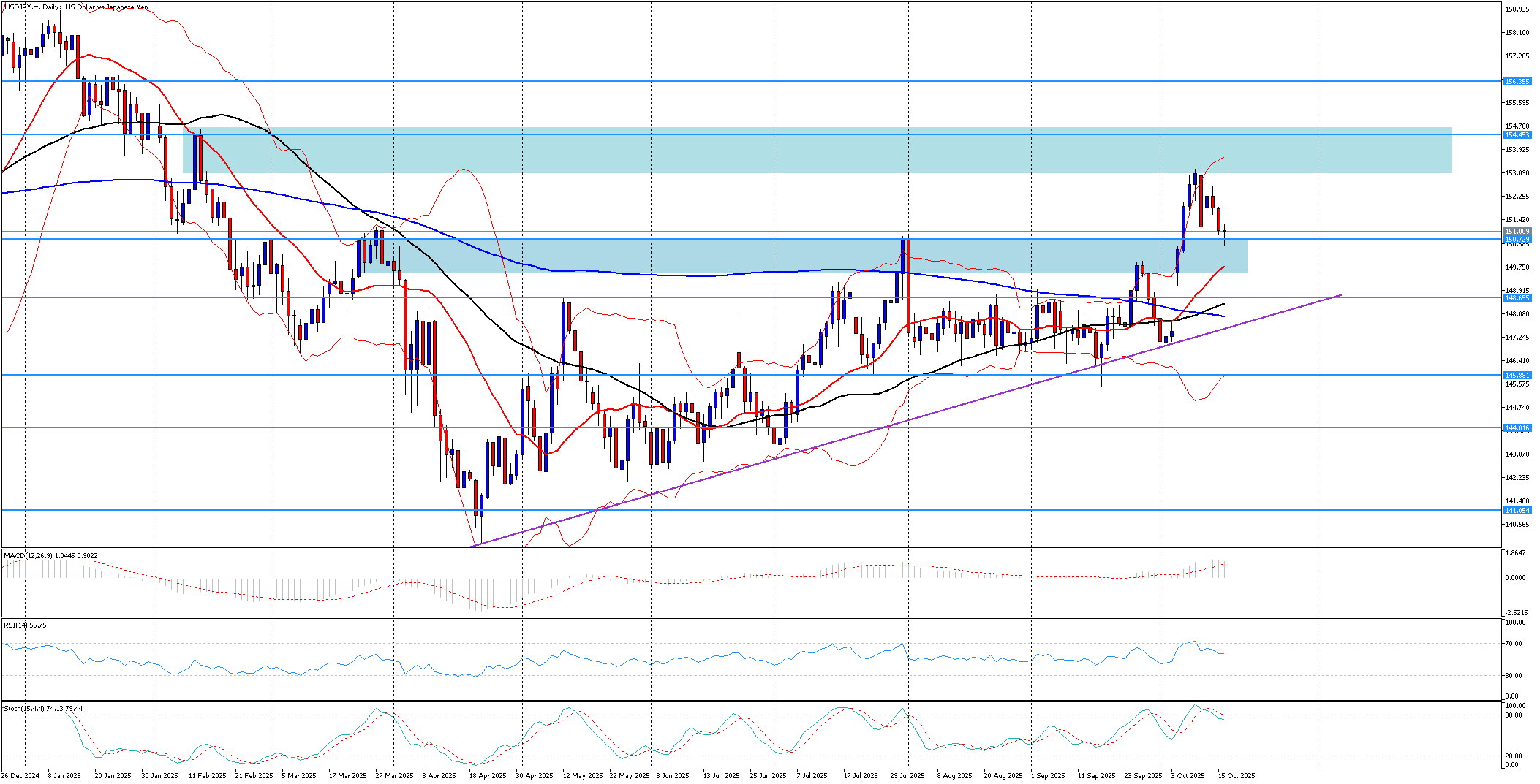 Měnový pár USD/JPY dokázal během pondělí zcela vymazat úvodní ztráty a po projevu předsedy Federálního rezervního systému Jeromea Powella se ustálil poblíž psychologické hranice 151,00. Powell ve svém vystoupení ocenil odolnost americké ekonomiky, zároveň však upozornil na zpřísňující se finanční podmínky a rostoucí rizika na trhu práce. Jeho komentáře naznačily, že Fed by mohl ukončit proces snižování své bilance, což vyvolalo nejistotu ohledně dalšího směřování měnové politiky a přineslo tlak na americký dolar. Z technického pohledu zůstává situace vyvážená. Pokud by se prodejní tlak zvýšil, trh by mohl otestovat psychologickou hranici 150,00. Průlom pod tuto úroveň by mohl urychlit pokles směrem k 50dennímu a 200dennímu klouzavému průměru, které se nacházejí poblíž 148,35. Další významnou podporu představuje střednědobá vzestupná trendová linie v oblasti 147,50, která by mohla působit jako klíčová obranná zóna proti hlubším ztrátám. Naopak, odraz od úrovně 151,00 by mohl otevřít prostor pro růst směrem k 151,65 a dále k osmiměsíčnímu maximu na 153,20. Momentum indikátory přinášejí smíšené signály – MACD postupně oslabuje, i když se stále drží nad nulovou i signální linií, zatímco stochastický oscilátor se přibližuje k přeprodanému pásmu, což naznačuje možnost krátkodobého obratu vzhůru. Celkově Powellův opatrný tón zvýšil rizika poklesu pro dolar vůči jenu, ale pár zůstává technicky podporován nad klíčovými úrovněmi. Rozhodující průlom pod 150,00 by však mohl spustit výraznější korekční fázi.