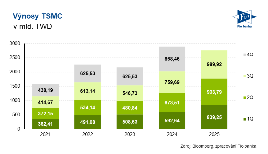 TSMC očekává ve čtvrtém kvartále výnosy v rozmezí 32,2 až 33,4 mld. USD, když trh predikoval pouze 31,23 mld. USD.