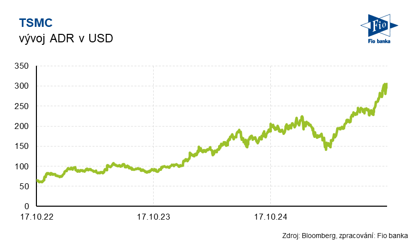 Klíčová slova: USA | ADR | Akcie | Bloomberg | Certifikáty | Dividendový výnos | Marže | P/E | Ukazatel | Výnos | Wall Street | USD | Obchodování | Vývoj ceny | Zisk | Výsledky | Banka | Fio banka | Cena | Fio | Management | Trh | Cílová cena | Hrubá marže | Provozní marže | ROCE | ROE | Kapitalizace | Výhled | Konsensus | Výnosy | Očekávání | Kapitálové výdaje | Čistý zisk | Generální ředitel | Hospodaření | Výsledky hospodaření | TWD | Provozní zisk | Finanční ředitel | Meziroční růst | Výdaje | Vývoj | Manufacturing | Růst | WEI | Růst výnosů | Umělé inteligence | Ceny | Rentabilita | Technologie | TSMC | Taiwan Semiconductor Manufacturing | TSM | Společnosti | Společnost | Výsledky společnosti | Celoroční výhled | 3М | Akcie TSMC | Taiwan Semiconductor Manufacturing (TSMC) | Taiwan Semiconductor | Platformy | Rentabilita vlastního kapitálu | Americké depozitní certifikáty | Depozitní certifikáty | Fio banka, a.s. | Rok 2025 | Michal Bárta | Vývoj ceny ADR | Výrobce polovodičů | Taiwan | Management společnosti |