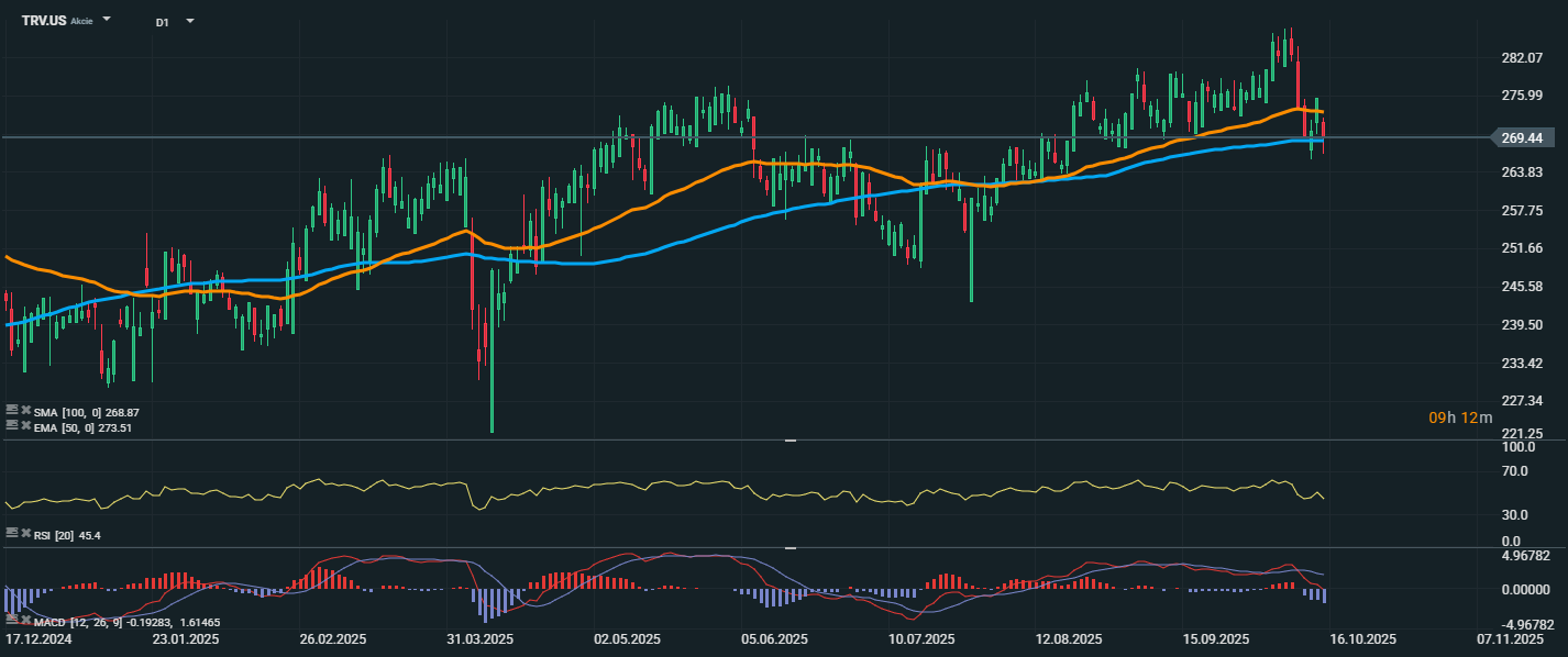 Akcie Travelers aktuálně se obchoduje na úrovni 269,44 USD. Cena prorazila pod EMA 50 (273,51 USD) a testuje support v podobě SMA 100 (268,87 USD). RSI klesl na hodnotu 45,4, což značí slábnoucí momentum, ale stále v neutrálním pásmu. MACD vytvořil negativní překřížení pod nulovou linií a histogram se prohlubuje, což potvrzuje zesilující tlak prodejců.