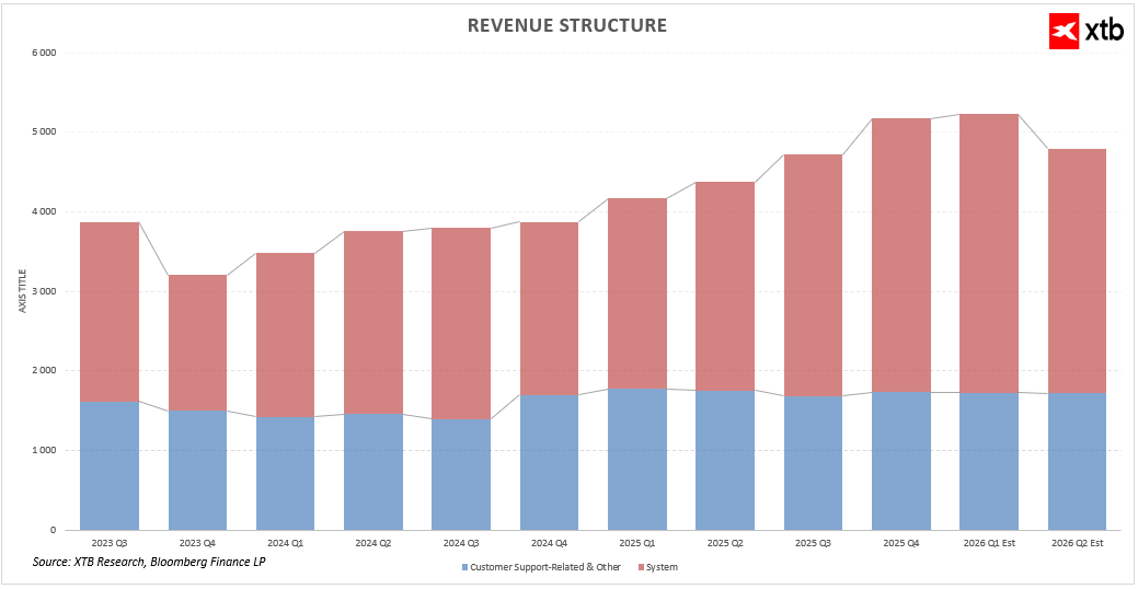 Segment systémů, zaměřený na pokročilá technologická řešení, vykazuje jasný vzestupný trend. Po krátkém poklesu na konci roku 2023 se tržby rychle vzpamatovaly a nadále rostou, což odráží silnou poptávku po moderních technologiích výroby čipů, zejména v segmentech pamětí a dalších inovativních řešení.