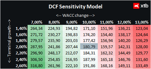 Toto ocenění je založeno na základních tržbách a finančních prognózách, s WACC ve výši 10 % a konzervativní konečnou mírou růstu ve výši 2 %. Finanční parametry jsou založeny na průměrných údajích z posledních let, což zajišťuje realistický obraz.