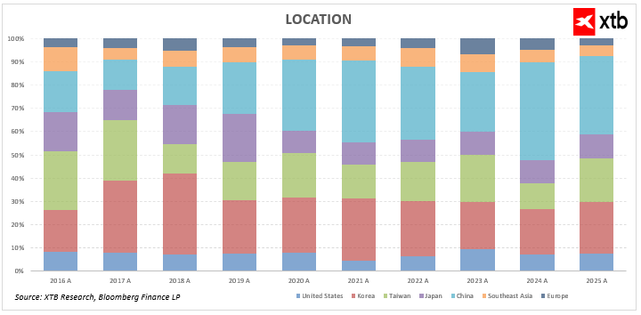 Z geografického hlediska má společnost Lam Research silnou mezinárodní přítomnost, která generuje většinu jejích příjmů. Mezi klíčové trhy patří Jižní Korea, Čína, Japonsko a Tchaj-wan, kde společnost zaznamenává nejvyšší příjmy. Ačkoli Spojené státy představují menší část tržeb, jejich podíl roste, což naznačuje rostoucí význam společnosti Lam na jejím domácím trhu. Evropský trh je nejmenší, ale zůstává stabilní.