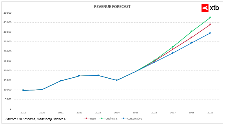 - Konzervativní scénář předpokládá, že po počátečním prudkém růstu se dynamika zpomalí v důsledku snížení investic a rostoucí konkurence. Společnost Lam však i nadále roste, což dokazuje odolnost jejího obchodního modelu i v náročnějších podmínkách.