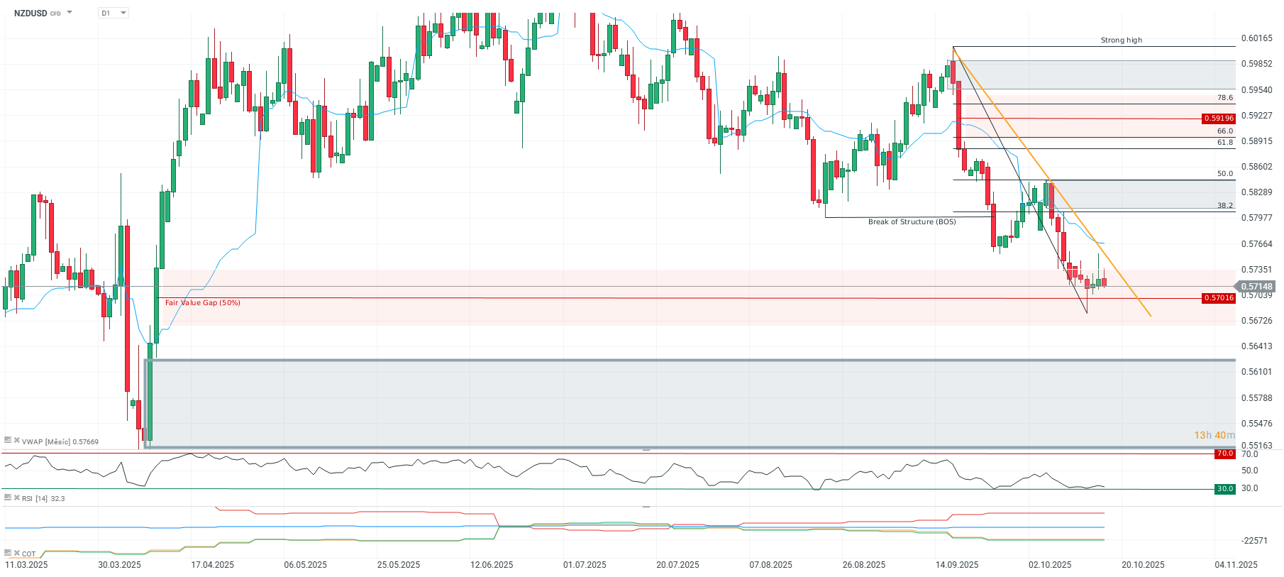 Měnový pár NZD/USD se už několik týdnů pohybuje v jasně sestupném trendu, který vznikl po Break of Structure ze srpna. Trh vytváří nižší maxima i minima a stále respektuje klesající trendovou linii, která společně s VWAPem (0,5766) drží cenu pod tlakem.