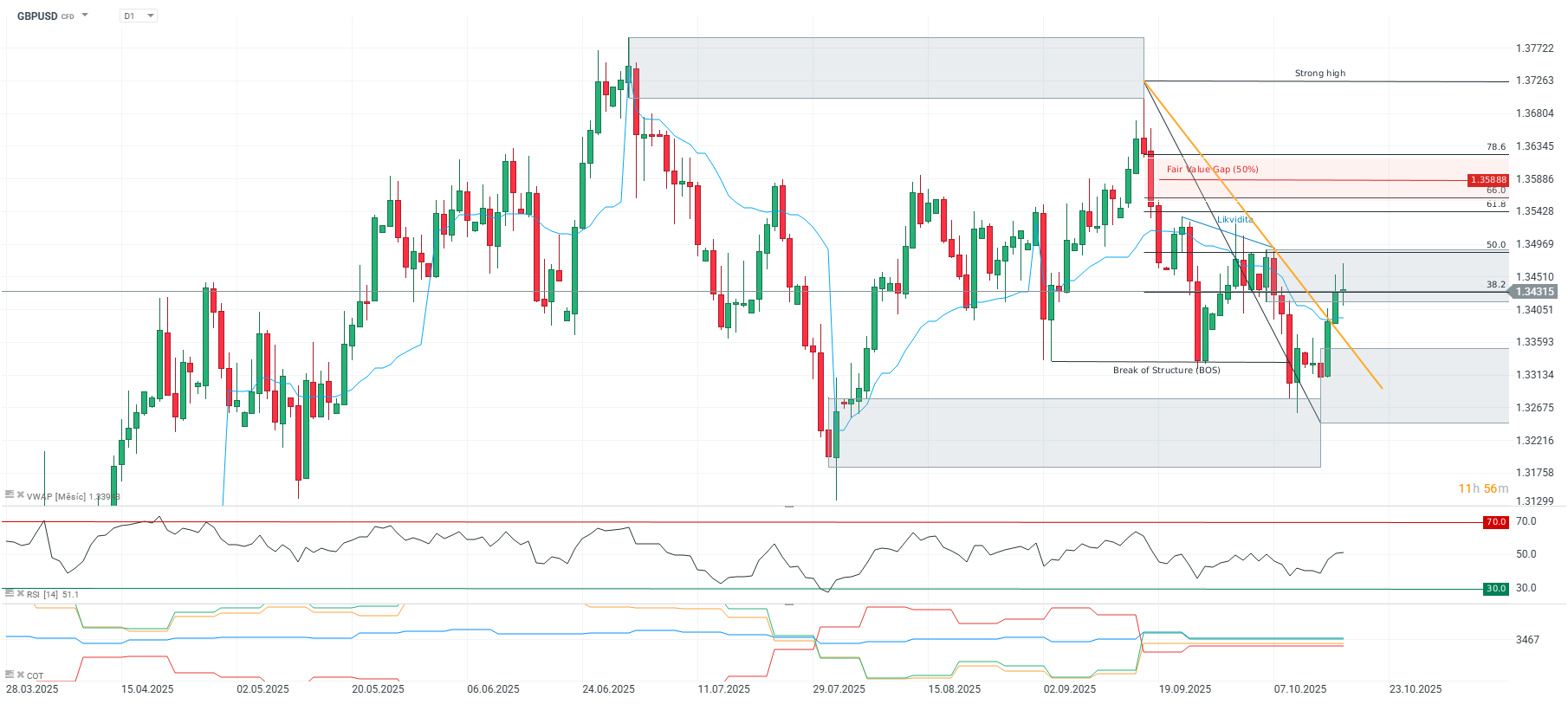 Měnový pár GBP/USD se po výrazném poklesu ze září snaží o korekční růst, přestože struktura je stále bearish. Na denním grafu (D1) je vidět, že trh vytvořil Break of Structure (BOS), po kterém se odrazil z oblasti silného demand levelu a nyní testuje horní hranici supply zóny kolem úrovně 1,3420–1,3490. Cena zároveň proráží klesající trendovou linii spolu s měsíčním VWAPem. To může být první znamení, že nastává korekční vlna směrem nahoru.