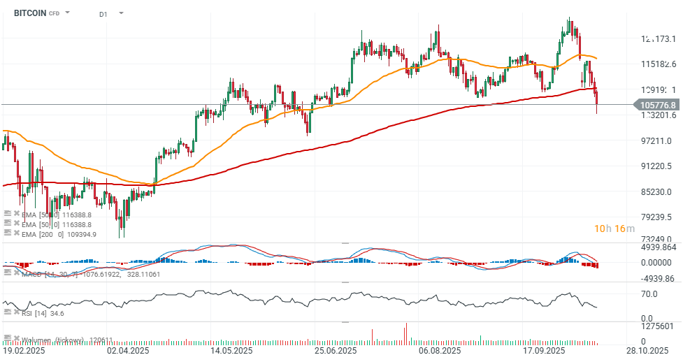 Cena Bitcoinu dnes klesá o více než 2 % a testuje oblast kolem 105 000 USD – tedy pod 200denním EMA (červená linie), který symbolicky odděluje downtrend od uptrendu.