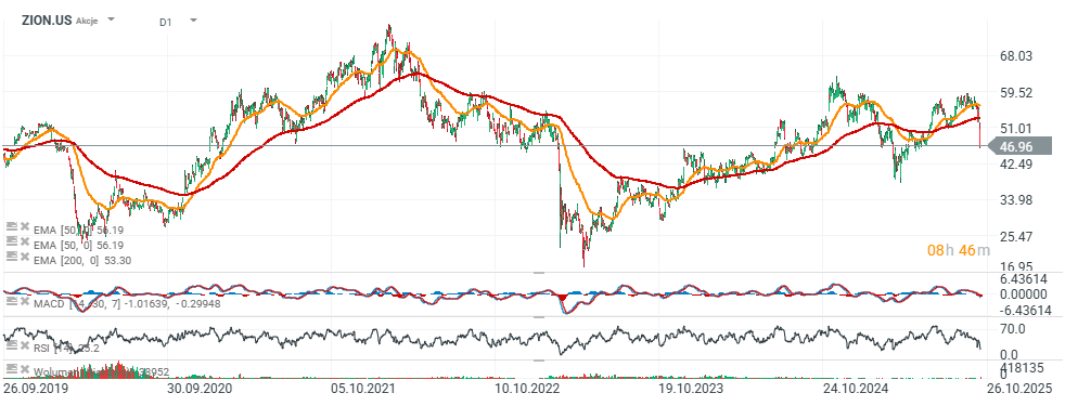 Zions zveřejní výsledky za 3Q v pondělí. Akcie dnes v pre-marketu rostou téměř o 5 %. Baird zvýšil doporučení na „Outperform“ a stanovil cílovou cenu 65 USD, což je téměř o 40 % výše než současná cena akcie.
