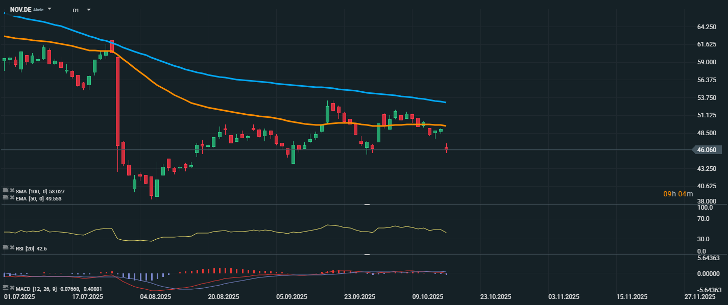 Akcie společnosti Novo Nordisk aktuálně oslabují a klesly na úroveň 46,06 EUR. Z technického pohledu akcie zůstávají v medvědím trendu. Cena se drží pod oběma klouzavými průměry – EMA 50 (49,55 EUR) i SMA 100 (53,03 EUR), což potvrzuje pokračující slabost trhu. Nedávný pokus o růst nad EMA 50 byl zamítnut a aktuální svíčky naznačují návrat prodejního tlaku. RSI osciluje na hodnotě 42,6, což značí mírný prodejní tlak, ale zatím bez vstupu do přeprodaného pásma.