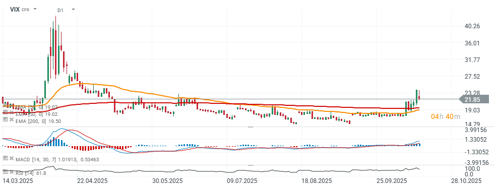 - Spotový index VIX vyskočil na úroveň kolem 24 — nejvýše od dubnového výprodeje způsobeného cly — než se stabilizoval.