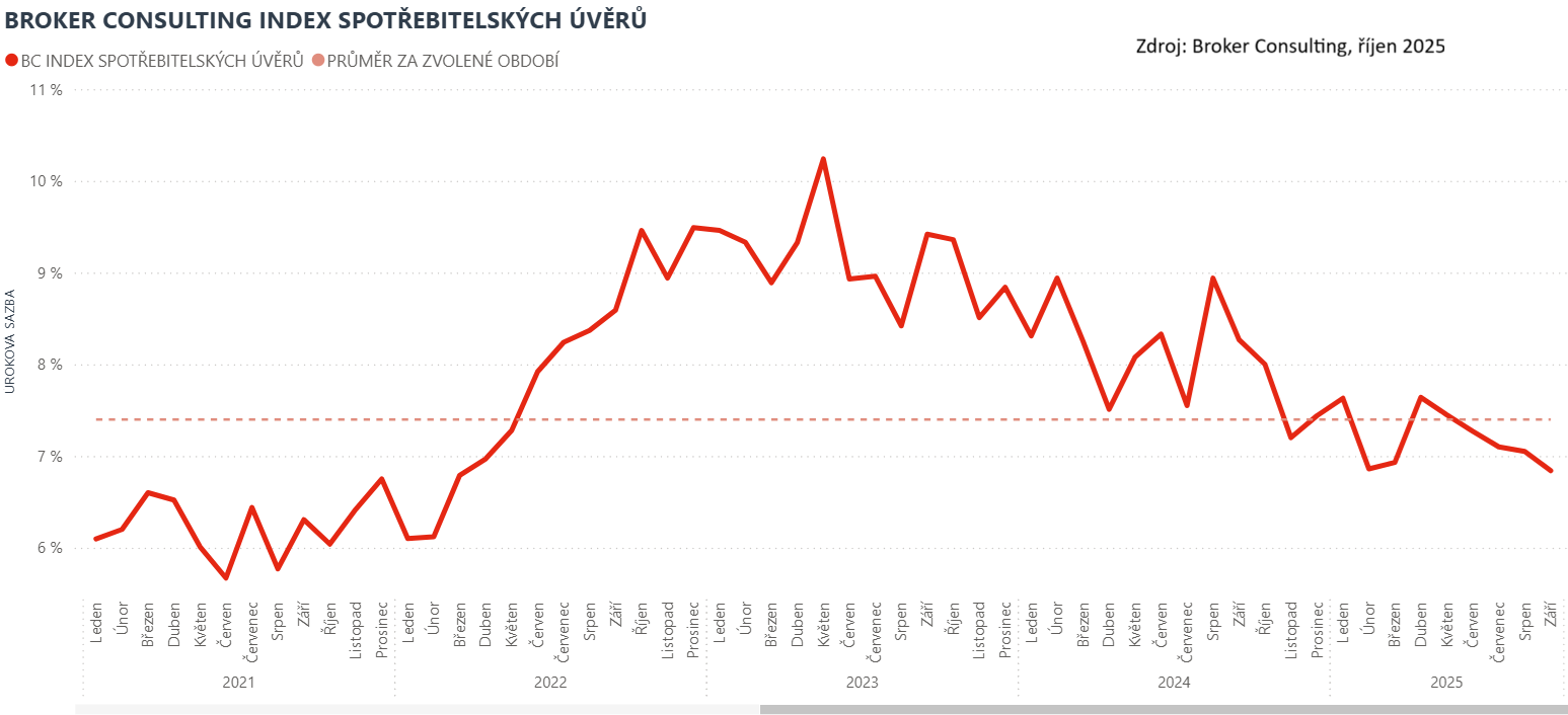 Úrokové sazby u spotřebitelských úvěrů dál klesají. Podle Broker Consulting Indexu se v září průměrná sazba snížila na 6,84 %, což je o 0,21 procentního bodu méně než v srpnu (7,05 %). Trh tak pokračuje v trendu pozvolného snižování sazeb, který začal už na jaře. Září je zároveň třetím měsícem letošního roku, kdy se sazby bezúčelových úvěrů dostaly pod hranici sedmi procent, tentokrát však na dosud nejnižší hodnotu roku.