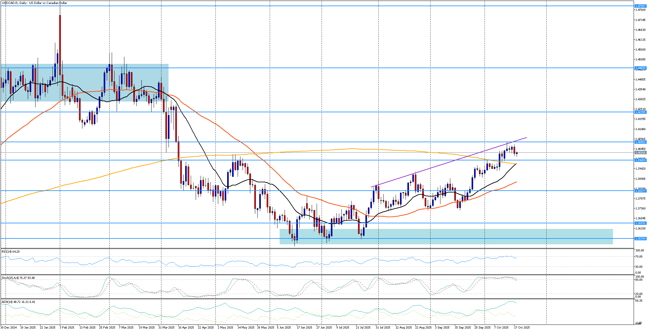Měnový pár USD/CAD se obchoduje pod šestiměsíčním maximem 1,4080, kterého dosáhl na začátku týdne. Na trh doléhají rostoucí obavy z eskalace obchodních napětí mezi USA a Čínou, nejistota spojená s částečným uzavřením americké vlády a zvýšená očekávání, že Federální rezervní systém brzy přistoupí ke snižování úrokových sazeb. Tyto faktory společně oslabují dolar a brzdí jeho další růst vůči kanadské měně. Z technického pohledu zůstává střednědobý výhled nadále býčí. Na grafech se začíná formovat potenciální „zlatý kříž“ mezi 20denním a 200denním klouzavým průměrem, což je tradičně považováno za signál pokračování rostoucího trendu. Přesto krátkodobé indikátory naznačují, že trh může nyní vstoupit do fáze konsolidace. MACD se pohybuje těsně nad svou signální linií a nevykazuje jasnou dynamiku, zatímco RSI po přiblížení k hranici překoupenosti 70 začíná mírně klesat, což může naznačovat ochlazení býčího tempa. Pokud by se nákupní zájem obnovil, další rezistenci lze očekávat na úrovni dubnového vrcholu 1,4720. Naopak, v případě ztráty momenta by průlom pod 1,4020 mohl otevřít prostor k testování 20denního a 200denního klouzavého průměru v oblasti 1,3960. Hlubší pokles by mohl vést k otestování podpůrné zóny mezi 1,3890 a 1,3930, kde by se trh mohl pokusit znovu stabilizovat. Celkově zůstává střednědobý trend páru USD/CAD pozitivní, avšak krátkodobý technický obraz naznačuje, že trh může projít fází mírného pullbacku nebo konsolidace před případným obnovením růstového pohybu.
