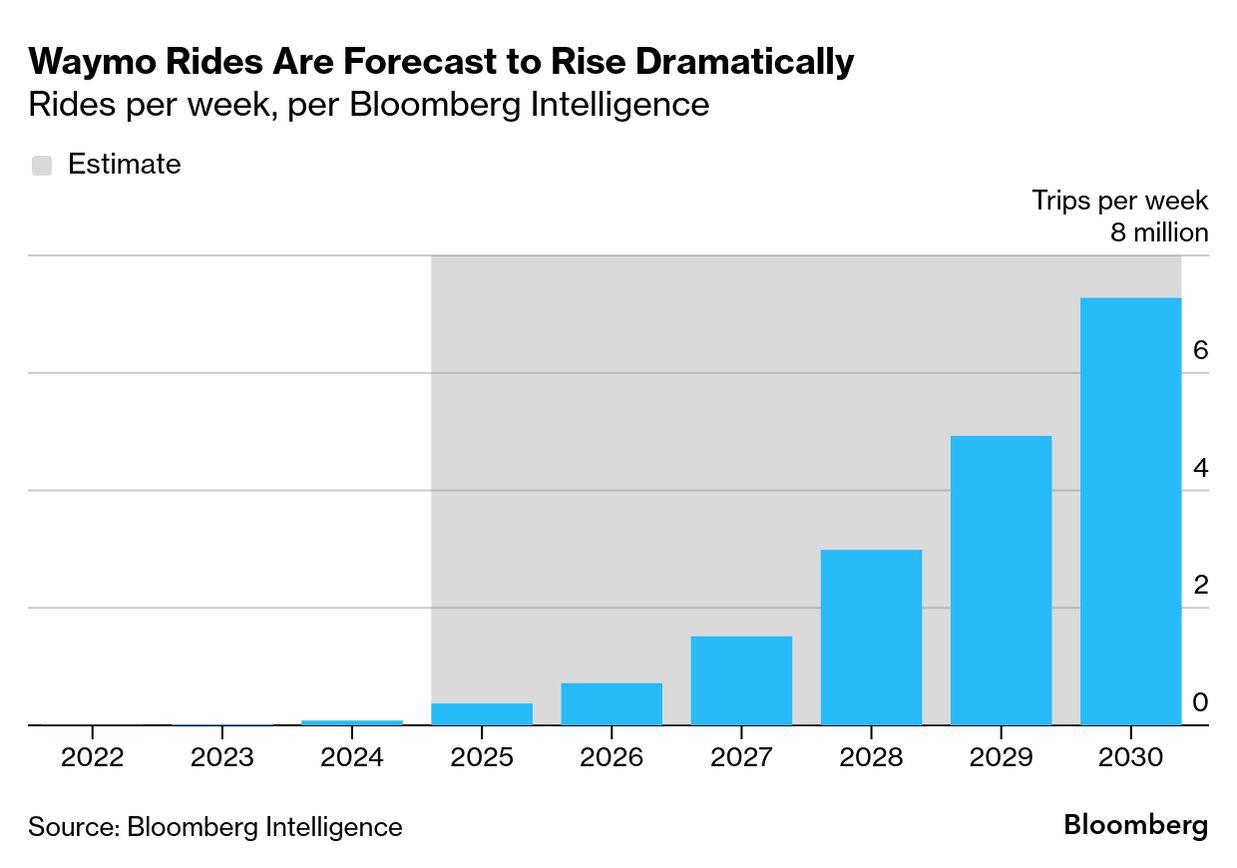 Podle analýzy Bloombergu by se počet jízd realizovaných společností Waymo měl zvýšit na více než 6,5 milionu, zatímco analytici Goldman Sachs odhadují, že podíl autonomních vozidel na celkovém silničním provozu překročí 7 %, což by odpovídalo tržní hodnotě až 6,5 miliardy dolarů.