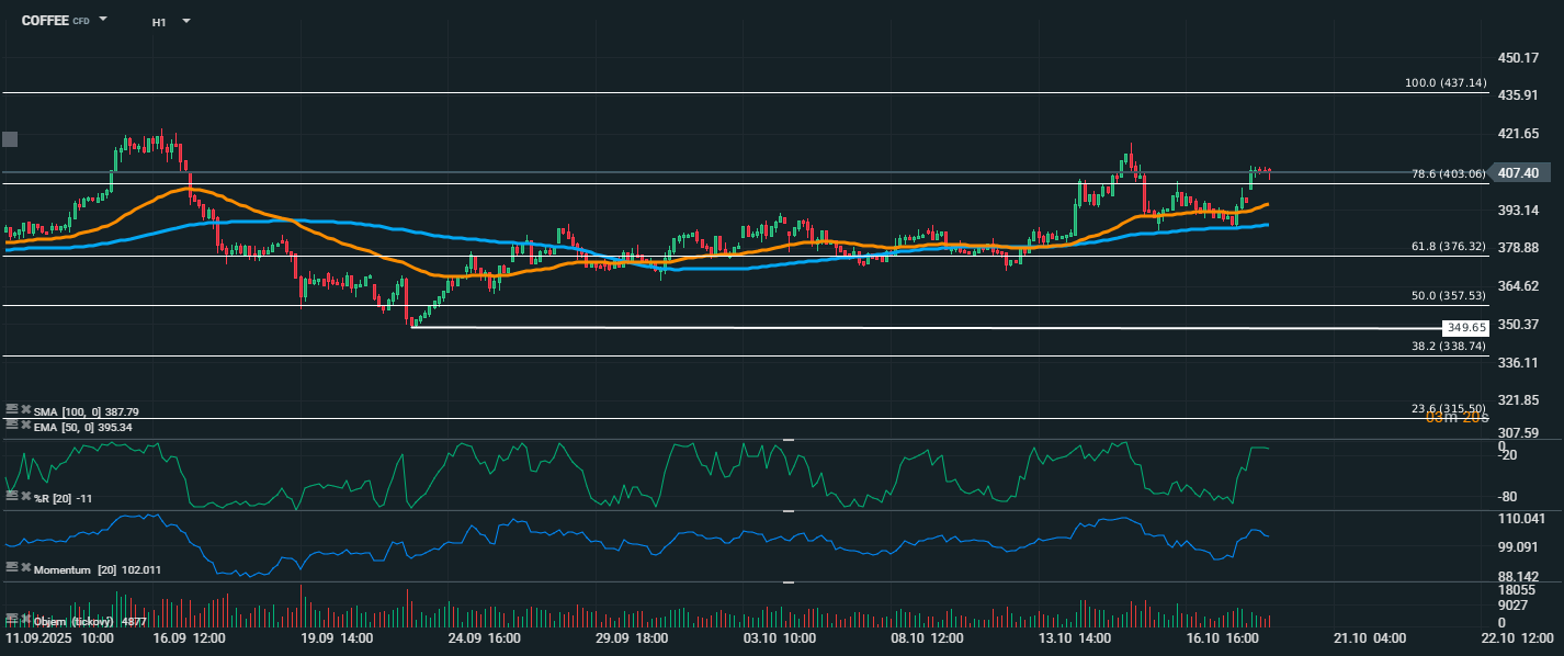 Cena kávy se pohybuje na úrovni 407,40 USD, tedy těsně nad Fibonacciho úrovní 78,6 % (403,06 USD). Krátkodobě zůstává trh v býčím nastavení, což potvrzuje jak pozice nad EMA 50 (395,34 USD), tak nad SMA 100 (387,79 USD). Oba klouzavé průměry fungují nyní jako dynamické podpory. Indikátory potvrzují silné momentum – Momentum dosahuje hodnoty 102,0 a %R je na úrovni -11, tedy těsně pod překoupeným pásmem. To naznačuje, že kupci stále dominují trhu, ačkoli může dojít ke krátkodobému zpomalení růstu nebo menší korekci.