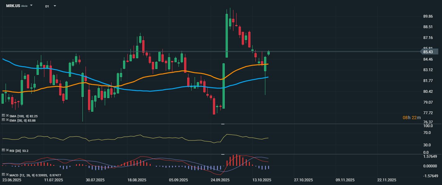 Akcie společnosti Merck zaznamenaly v posledních dnech výrazné oživení a aktuálně se obchodují na úrovni 85,43 USD, tedy nad klouzavými průměry EMA 50 (83,88 USD) a SMA 100 (82,25 USD). Proražení nad tyto průměry je býčím signálem a může znamenat potvrzení krátkodobého obratu po předchozím výprodeji. RSI (53,2) se nachází v neutrální oblasti a signalizuje, že trh má prostor pro další růst bez známek překoupenosti. MACD se blíží k signální linii a ukazuje možné býčí překřížení, které by podpořilo pozitivní momentum.