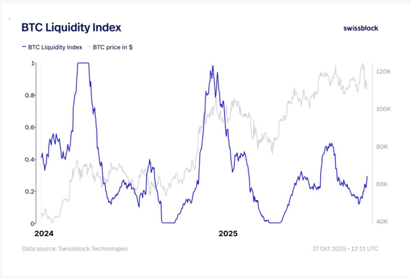 Mezitím opět roste Swissblock Bitcoin Liquidity Index, který sleduje on-chain aktivitu, toky na burzách a spotovou poptávku – a signalizuje prostředí příznivé pro růst cen.